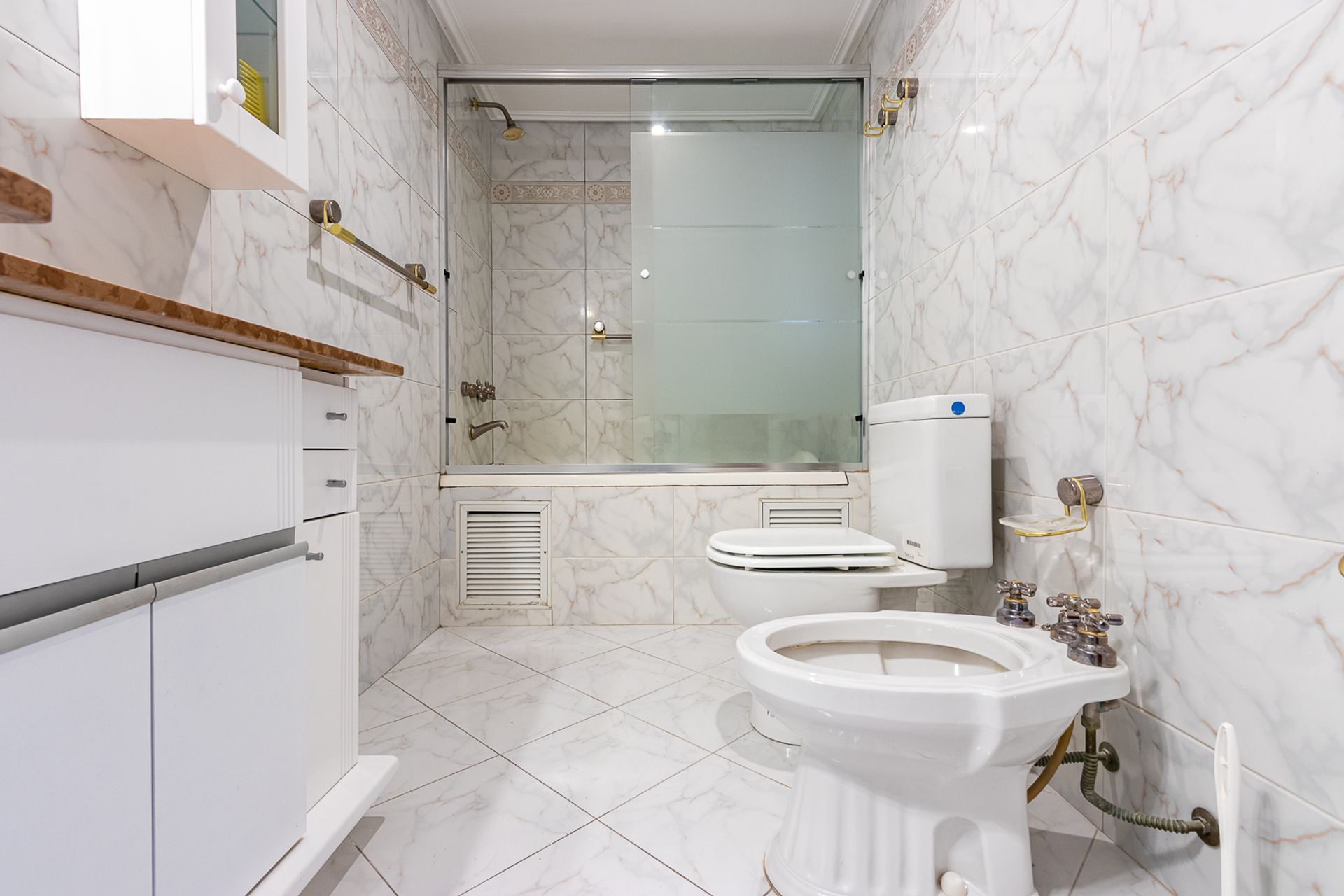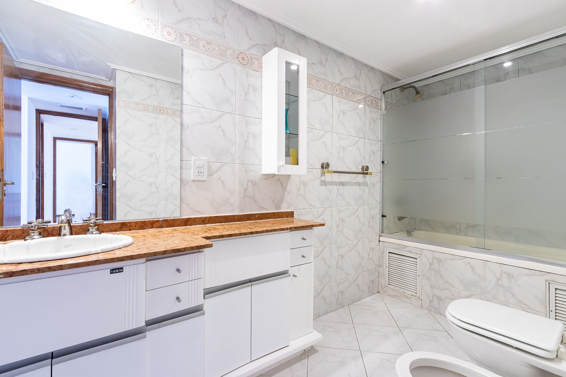 Baño completo con bañera, artefactos de primeras marcas y revestimientos acorde en paredes, mampáras de vidrios.